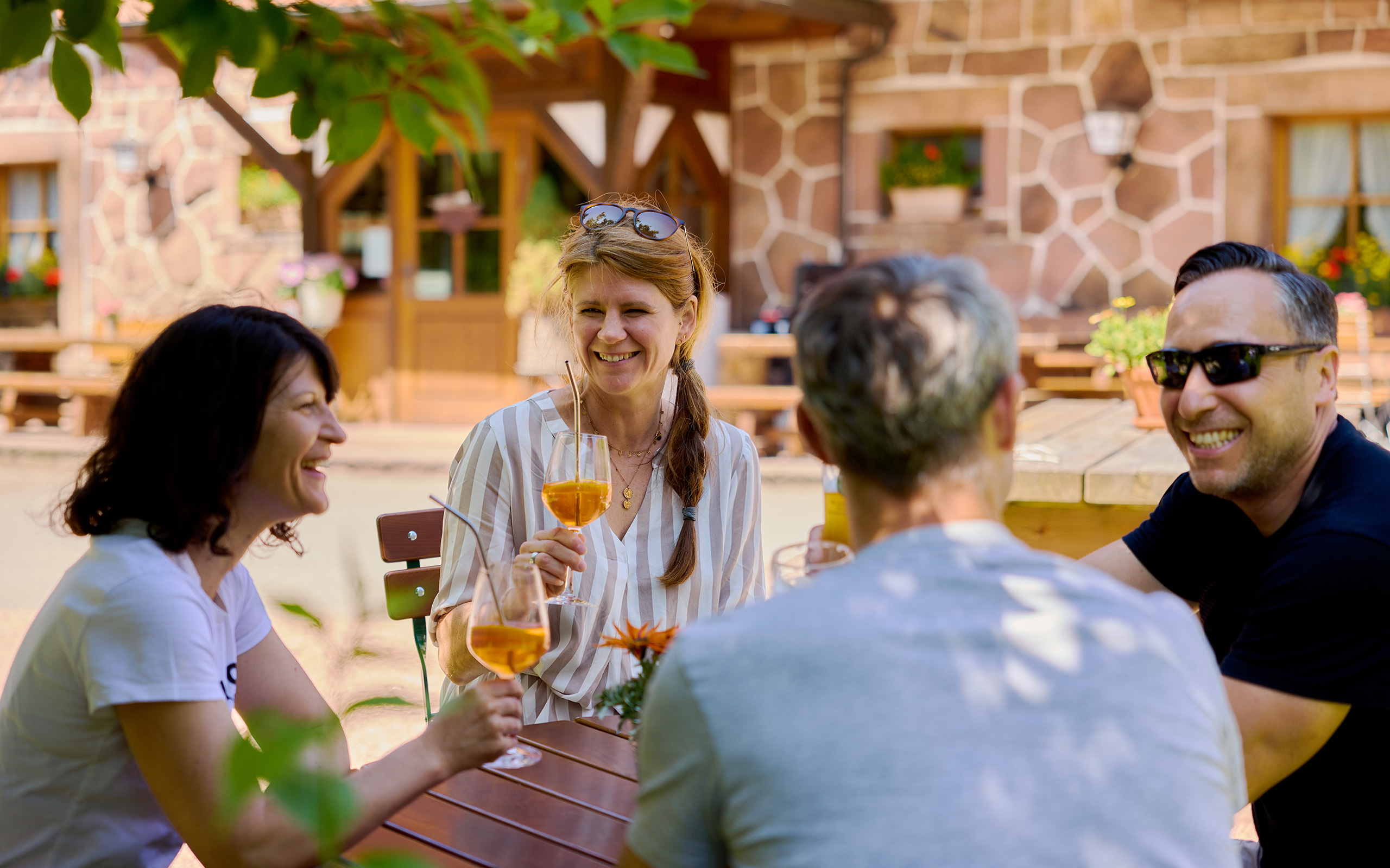 In unserer gemütlichen Vesperstube treffen sich unsere Gäste gerne auf ein Gläschen Most, Bier oder Wein, um in geselliger Runde die Ereignisse des Tages Revue passieren zu lassen.